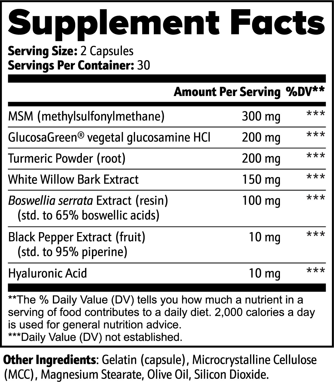 Strong joints are essential to a well structured body, this formulas ingredients are specifically for that. Recommended as a dietary supplement, adults take two (2) capsules daily. For best results, take with 6-8 oz of water or as directed by healthcare professional.
