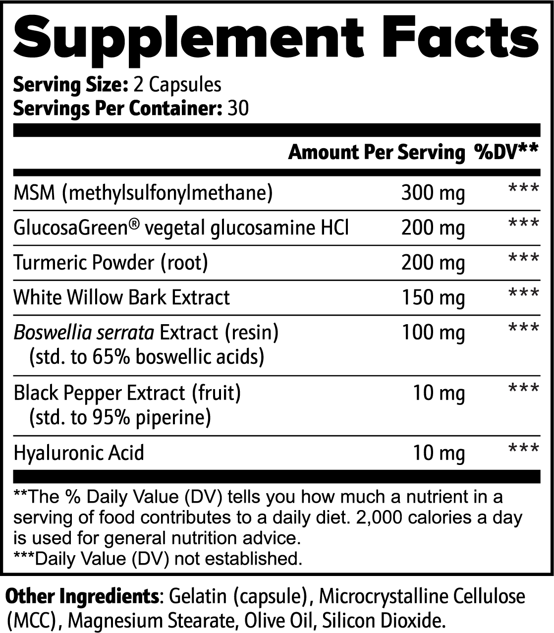 Ingredients: MSM (methylsulfonylmethane), GlucosaGreen® vegetal glucosamine HCl, Turmeric Powder (root), White Willow Bark Extract, Boswellia serrata Extract (resin)(std. to 65% boswellic acids), Black Pepper Extract (fruit) (std. to 95% piperine), Hyaluronic Acid.